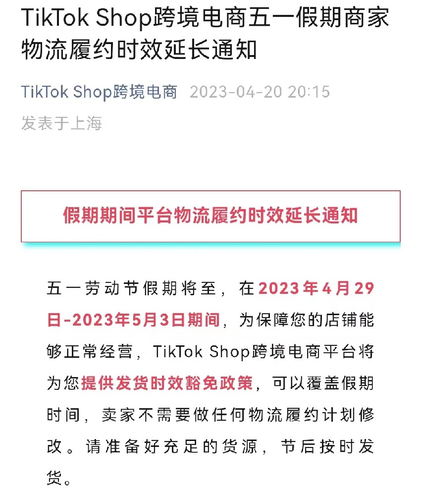 TikTok Shop跨境电商发布关于五一假期延长商家物流绩效限制的通知。根据通知,2023年4月29日至2023年5月3日期间,TikTok Shop跨境电商平台将为商家提供发货限制豁免政策,可覆盖节假日时间,商家无需对物流绩效计划进行任何变更。 具体来说,2023年4月29日至2023年5月3日生成的商户订单最晚安排发货日期为2023年5月6日。要求商家按时安排装运。同时,请在发货安排完成后,及时将订单包交付给物流商,以免延误履约。 同时,商家可以在卖家中心设置“休假模式”。设置休假模式后,所有商品都会显示售罄状态。如果商家在假期正常营业,也可以随时关闭该功能。 (图源:TikTok Shop跨境电商公众号,下同) 需要注意,发货时间过长也会对店铺绩效带来不良影响,若有能力进行假期发货,希望商家能正常履约。 此外,劳动节假期期间,部分地区的代收服务商将暂停代收服务,商家需提前做好发货安排或选择平台仓库备货,以利于履约顺利进行。服务提供商的假期时间如下: 五一假期,极兔提供正常的代收仓储服务;万色提供正常的收款和仓储服务;燕文清远正常收派收入,燕文其他城市五一放假,其他时间正常运营。 客服方面,针对没有五一假期习俗的海外市场,面对海外买家的日常咨询,建议跨境商家提前安排自动回复和客服值班,并注意以下几点,确保买家能得到及时回复。 自动回复:请告知买家五一假期的物流安排和发货计划;请告知买方五一后的最早交货日期;五一前后推送店铺的营销活动,留住客户;每天安排值班人员回答采购员的问题。 值得一提的是,TikTok Shop近日宣布,4月10日起支持马来西亚、泰国、越南、菲律宾、新加坡跨境商户和MCN机构绑定中国大陆银行卡,商户和MCN机构可使用中国大陆银行卡实现人民币跨境一步收款。 跨境商户和MCN机构只需在商户后台绑定一张中国大陆银行卡(注:只能绑定同名的企业银行账户),其收入会定期以人民币汇入这张银行卡。平台将自动完成本币与人民币的外汇结算,平台暂不收取任何手续费。